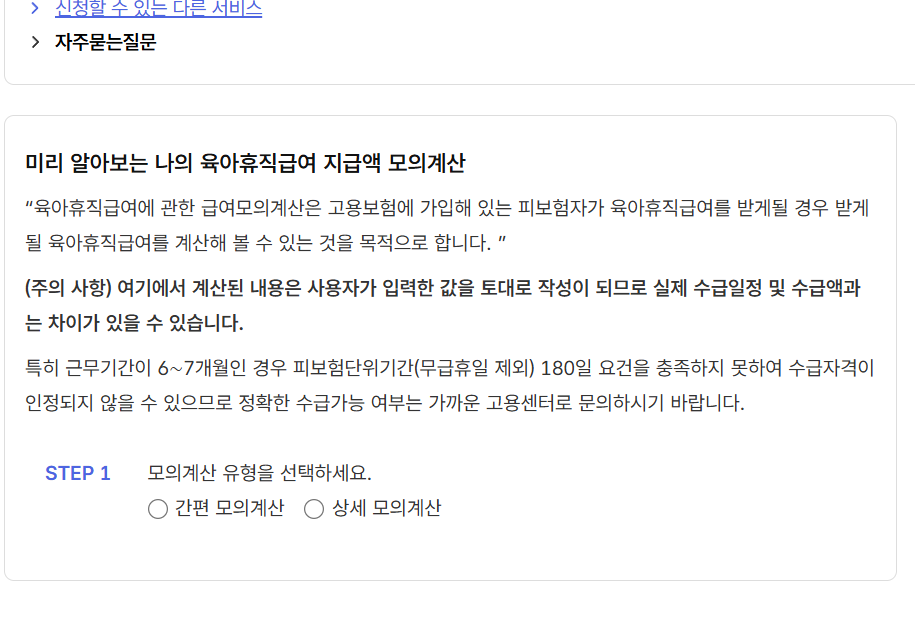 3. 스크롤을 내리면 미리 알아보는 나의 육아휴직급여 지급액 모의계산이 있습니다