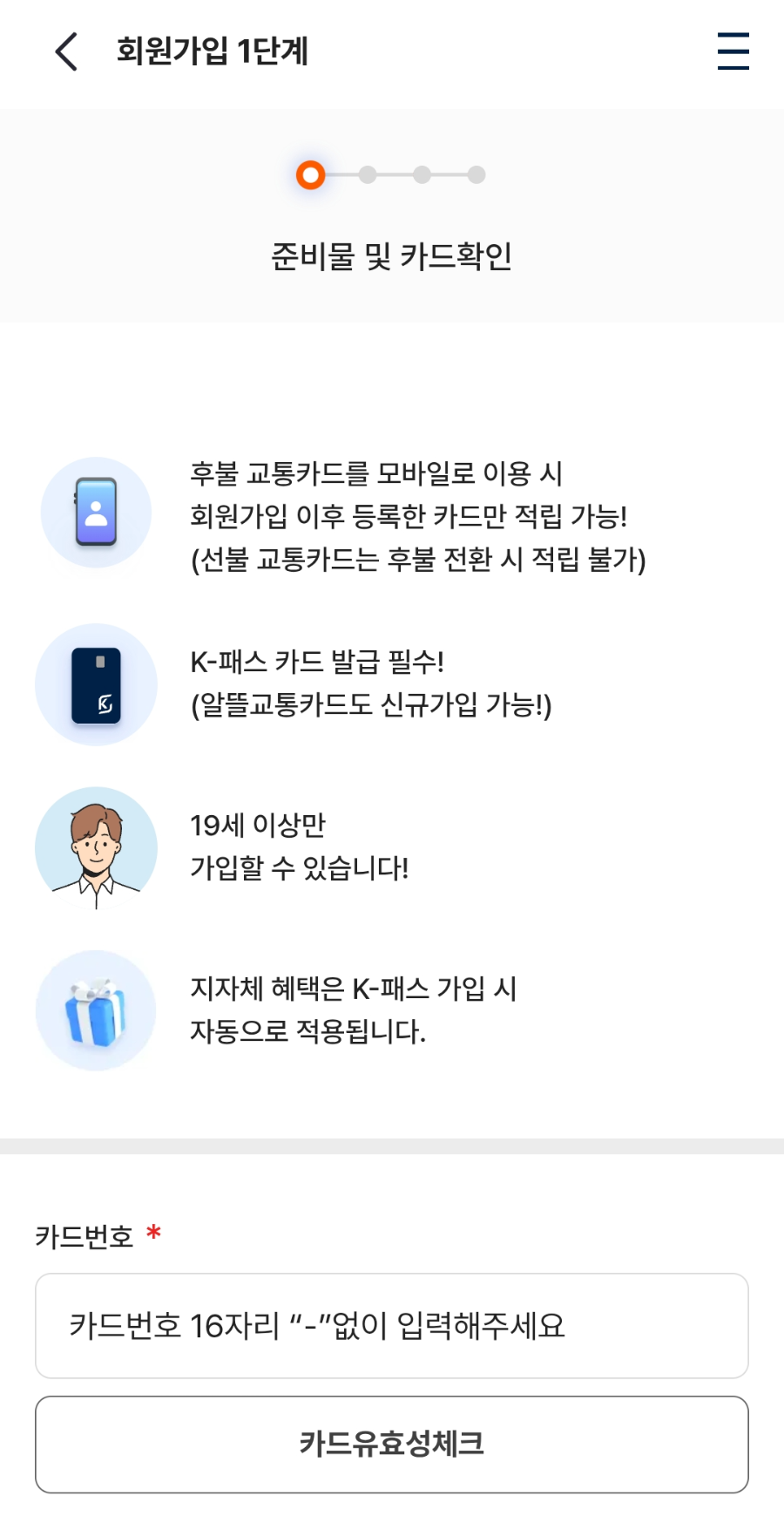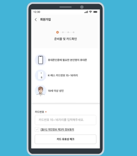 3. 카드번호 15~16자리 입력 후 유효성 체크 (K패스 카드가 있어야합니다. 신규발급 가능)